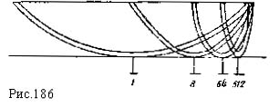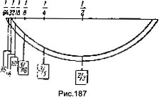 Действительно, при увеличении вдвое Р и при таком же уменьшении /, х не остается неизменным, а уменьшается, но не вдвое, как полагал Леонардо, а вчетверо. Таким образом, вопреки утверждению всех исследователей (Шустера, Марколонго и Харта), и во второй своей формулировке Леонардо не установил правильного соотношения, но он подошел очень близко к нему. Поскольку методика его опыта мало отличается от современной методики в этом вопросе и поскольку все величины, которыми ему приходилось здесь оперировать, поддавались вполне точному измерению, он, несомненно, продолжая работать в этом направлении, достиг бы и правильных результатов. Мы располагаем лишь очень скудными сведениями о продолжении работы Леонардо над этим вопросом, но такие работы существовали, что подтверждает следующая запись, очевидно также отражающая непосредственные результаты эксперимента: "Я нашел, что стержень в 12 локтей (рис. 186), если к нему подвесить в середине 1 фунт веса, будет иметь кривизну (incurvatura) в 1 локоть, и я хочу знать, какой вес будет требовать стержень в 6 локтей такой же толщины, для того чтобы создать тот же локоть дуги.