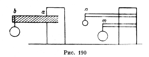Столь же глубокое проникновение обнаруживает и то обстоятельство, что Леонардо рассматривает изгиб балки, укрепленной одним своим концом, в связи с изгибом балки, лежащей на двух опорах, как это делается и в современных курсах сопротивления материалов. Так, в середине последней из приведенных нами записей (в месте, обозначенном нами многоточием) он пишет: "В стержне (рис. 189), который будет закреплен одним из своих концов, а противоположным концом будет описывать или производить при своем опускании двенадцатую (dodecima) часть окружности, все степени (gradi) опускания будут равны, если они будут производиться равными весами" (С. А. 211 r. b.). В этом беглом, схематичном замечании Леонардо, очевидно, хочет сказать, что глубина прогиба балки, один конец которой укреплен, так же как и стрела прогиба балки, на двух основаниях, пропорциональна привешенному грузу, что правильно. К вопросу о прогибе балки, укрепленной одним концом, Леонардо, насколько нам известно, больше нигде не возвращается. Зато в двух записях он трактует вопрос о сопротивлении на изгиб такой балки. Обе эти записи относятся к числу ранних. Первую из них находим еще в кодексе "А". Она гласит: "Если стержень в 2 локтя (рис. 190) выдерживает 10 фунтов, то 1 локоть стержня той же толщины будет выдерживать 20, ибо сколько раз короткий стержень помещается в длинном, во столько раз больше он выдерживает веса, чем длинный.
