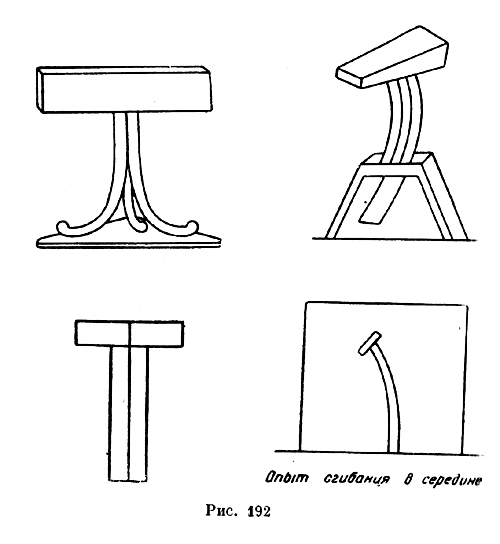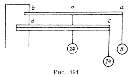 "Если стержень выступает из стены на 100 толщин и выдерживает 10 фунтов, то, сколько будет выдерживать 100 подобных стержней, выступающих также и связанных и соединенных вместе? Я утверждаю, что если 100 толщин выдерживают 10 фунтов, то 5 толщин будут выдерживать в 10 (не в 20 ли?) раз больше, чем 100, и если аb имеет 5 толщин и соединяет 100 таких стержней, то оно выдерживает 20 тысяч" (А. 49 r.). В данной записи, как обычно, Леонардо высказывает сначала некоторое, наиболее схематичное, априорное суждение, затем проверяет его на опыте, зафиксированном на рисунке, и, убедившись в ошибочности первого суждения, переходит к другому, обобщающему результаты опыта. При этом он делает неправильное предположение, что если в первом стержне отношение длины к стороне сечения (очевидно, квадратного) будет равно 100, то при соединении 100 таких стержней отношение это будет равно 5, в то время как оно будет равно либо 10, если новая балка будет сохранять квадратное сечение, либо 1, если балки будут накладываться одна на другую. Затем (мы предполагаем, что наша замена 10 на 20 правильна) Леонардо утверждает, что если отношение длины к стороне сечения уменьшилось в 10 раз, то сопротивление увеличилось во столько же раз, т. е. стало равным 200, а так как и стержней вместо одного стало 100, то сопротивление увеличилось еще в 100 раз, т. е. всего стало равным 20 000. Рассуждение это, как нетрудно заметить, очень мало убедительно (так как непонятно, чем обосновано умножение на 100) и весьма близко к рассуждению, обосновывающему сопротивление вертикальной опоры. Легко также увидеть, что и окончательная формула, которая может быть выведена из приведенного рассуждения, строится, примерно, так же, как строилась наиболее часто применяемая Леонардо формула сопротивления вертикальной опоры. Ибо Леонардо получает конечную величину сопротивления по той же формуле. Это в общем правильно, поскольку сопротивление изгибу балки, укрепленной одним концом, так же как сопротивление изгибу балки, лежащей на двух опорах, пропорционально кубу высоты сечения и обратно пропорционально длине ее. Придя к этому правильному результату, как и в ряде других случаев, чисто эмпирически, Леонардо опять-таки, очевидно, не считает полученное им решение окончательным и применимым во всех аналогичных случаях. Так, в примерно одновременной или, может быть, несколько более поздней записи "Атлантического кодекса" он пишет: "Правило поперечных опор, неподвижных в месте своего укрепления. "Опора nb (рис. 191) будет иметь такое сопротивление в n, как опора cd в с. Причина этого в том, что опора cd, имеющая по толщине вдвое больший диаметр по сравнению с верхней опорой аb, является по пятому положению в 4 раза более толстой, чем эта опора, и поэтому на одинаковом расстоянии от места их неподвижного укрепления выдерживает в 4 раза больший вес."Но половина опоры аb, т. е. nb, будет в n выдерживать столько же, как с конец опоры cd, так как, если диаметр толщины одной содержится 20 раз в толщине (не длине ли?) ее, то другая имеет такую же пропорцию и поэтому они представят одинаковые сопротивления для одинакового веса" (С. А. 86 v. b.).