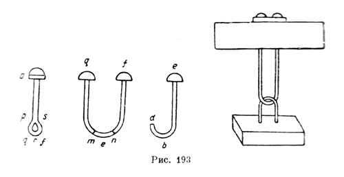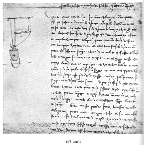 "Сила. Я спрашиваю, будет ли вес лучше поддержан двумя ординарными скобками (рис. 193) (uncini), изображенными в ebd, или же одной двойной скобкой, как feq. Я утверждаю, что раньше сломается одна двойная скоба. Докажу я это на опыте при помощи железной проволоки равномерной толщины. Ибо ясно можно понять без сравнения, что железную проволоку легче согнуть, чем разорвать. Если нижняя часть (fondo) крючка (ranpino) будет нагружена излишним весом, то его точка укрепления е будет сопротивляться, но точка d, не будучи укреплена, будет повиноваться стремлению веса и вместе с ним направится к земле. Нижняя же часть двойной скобы е укреплена в fqnm и не может сдвинуться, если только опоры не сломаются, а нижняя часть е нагружена не только в середине, но по всей своей плоскости и не может отделиться одним отделением (non si po dividere in se d´una sola divisione), почему необходимо, чтобы, если опоры имеют равномерную толщину, эта нижняя часть сломалась в двух местах, а именно в n и т. Железная (петля) or не сможет сломаться ни в r, ни в боковых частях кольца pqfs, ибо каждая из этих боковых частей имеет наполовину меньше веса, чем пространство между р и о, почему петля и сломается между о и p" (С. 7 v.). Ясно, что приведенная запись показывает нам Леонардо в разгаре его технических работ, пытающимся разрешить совершенно определенную задачу и еще не задающимся особыми теоретическими проблемами. Однако проблемы эти должны были возникнуть при расчленении объекта на его элементы и внимательном всматривании в эти элементы; такой подход сквозит из приведенных слов. Несколько общие, литературные и неуклюжие описания тех или иных технических явлений, которые мы встречали в писаниях Альберта или Джиорджио Мартини, заменяются цепким и трезвым анализом остро видящего практика-наблюдателя. Анализ этот не искажен никакими литературными влияниями и потому особенно плодотворен. Еще более интересна несколько более поздняя запись, описывающая экспериментальную установку для испытания сопротивления проволоки на разрыв: "Опыт с силой, которую может выдержать железная проволока разной длины. "Запомни, как ты должен сделать опыт на подвес или какой вес может выдержать железная проволока. "Для этого опыта поступай так (рис. 194). Привесь железную проволоку длиной в 2 локтя, или около того, в прочно укрепленное место, затем привесь к ней ведро (cavagno), или корзину (sporta), или что-нибудь другое по твоему усмотрению и в нее через маленькое отверстие в воронке (tramoggia) насыпай мелкого песку; когда эта железная проволока не сможет больше выдерживать и порвется, приладь клапан (moletta), который бы сразу закрыл воронку, так, чтобы песок больше не падал в корзину, которая упадет вниз... заметь, каков вес, который порвал эту проволоку; заметь, в каком месте эта проволока порвалась, и повтори много раз этот опыт, чтобы подтвердить, что она постоянно рвется в одном и том же месте. Затем сделай проволоку вдвое короче и заметь, насколько больше веса она выдерживает; затем сделай ее в ? длины первой и так раз за разом поступай с равными длинами, отмечая вес, которым каждая разрывается, и место, в котором разрывается. Проделай этот опыт с каждым металлом и деревом, камнем, канатом и всяким веществом, способным выдерживать нагрузку, и выводи в каждом случае общий закон (regola generale); так же поступай с опорами земляными, т. е. такими, которые, поддержив
