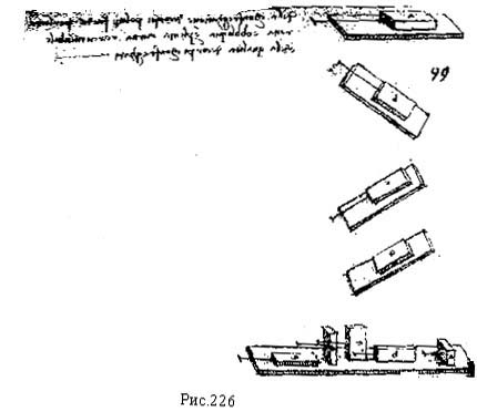"Трения бывают 4 родов, из которых первый — когда два тела гладки и ровны, как здесь предположено; второй — когда тащимое тело и поверхность, по которой происходит движение, шероховаты; третий — когда тащимое тело шероховато и поверхность, на которой оно движется, гладка; четвертый — когда тащимое тело и поверхность, по которой оно тащится, шероховаты. "Приведи опыт (da la sperienzia) в подтверждение того, что гладкая вещь, тащимая по гладкой поверхности, сопротивляется при движении своему двигателю с силой, равной четверти своей тяжести. А в двух следующих родах (трения) то же самое — двигать шероховатую вещь по гладкой поверхности, как и гладкую вещь по шероховатой поверхности; 4-й раз — когда шероховатая вещь движется по шероховатой поверхности. "Трение гладких тел будет тем больше терять в сопротивлении и приобретать в весе, чем менее наклонна поверхность, по которой оно движется, когда двигатель расположен над движимым (рис. 228).