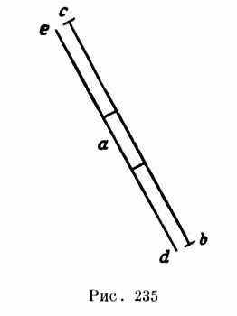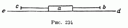 "По первой приведенной выше в этой вторая (фигура) ниже: трущееся тело (il chonfreghante) а на подвергающемся трению (chonfregato) fg отдает своему двигателю вес, равный четверти своего естественного веса (точно — che da di se peso al equale quarto della sua naturale gravita. al suo motore), ab — половину этих четырех, ас — четверть, ad — восьмую часть, каковая при движении, которое она проделывает от d к е, превращается в ничто вследствие последней наклонности, где происходит трение восьмой части, которая, достигнув прямой линии, разрушает всякую тяжесть с трением. "Заметь, что уменьшение тяжести при помощи уменьшения наклонности, на которой эта тяжесть находится, уменьшает также силу (p) трения. Следовательно, если вес а при трении имеет четыре фунта, то трение его имеет силу (р) сопротивления, равную одному фунту, а в средней наклонности е, будучи уменьшено на половину, остается равным двум фунтам на своем наклоне, четверть же его есть полфунта... "О трении. Плотное тело (la densita chonfregata), трущееся по плотной плоскости (la densita piana), помещенной в горизонтальном положении, имеет настолько же тяжелое трение при движении направо, как при движении налево (рис. 234).